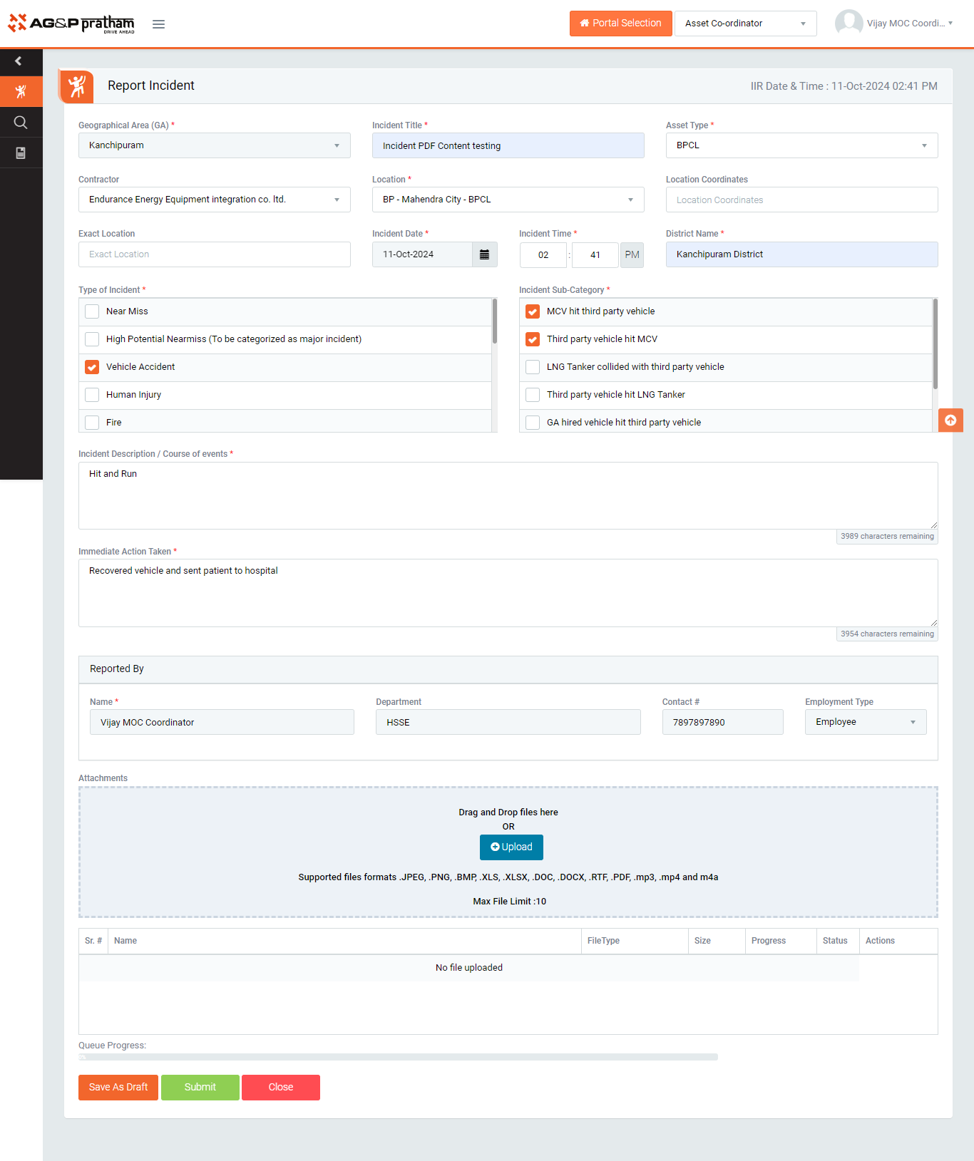 - Click on “Save as draft” if initial report is pending to fill to submit later.