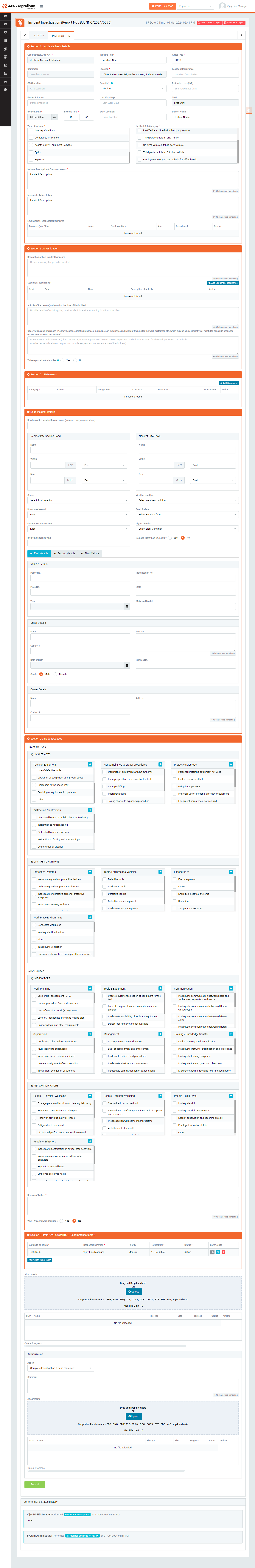 - SECTION D : Incident Causes - To add/edit incident causes like direct root causes and other factors, reasons for failure etc.