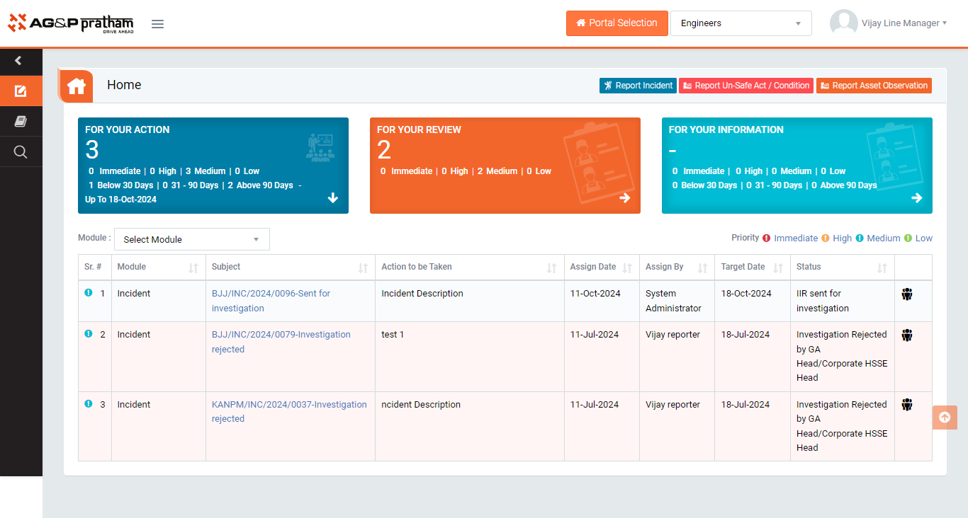 - PENDING ACTIONS : Display “Incident”, “EHS Observation”, “EHS Inspection”, “Equipment Inspection” and action items which needs to be performed. Also display the tasks which are saved as draft are displayed here. User will update final information and submit it for further action. (Display by default)