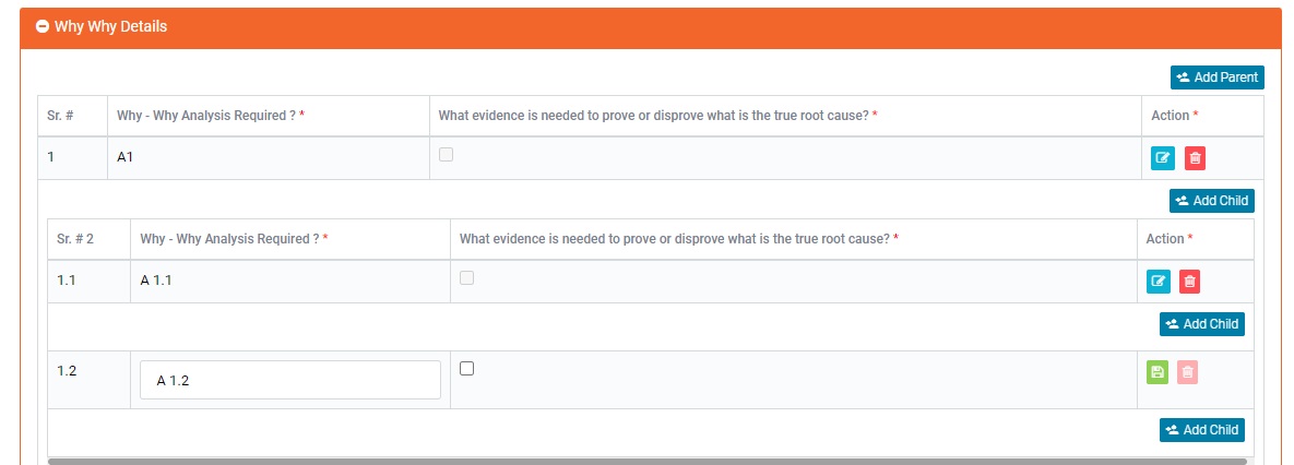 - WHYS DETAILS WITH FISH BONE DETAIL : If why-why analysis is required the user need to fill up the details in this section.