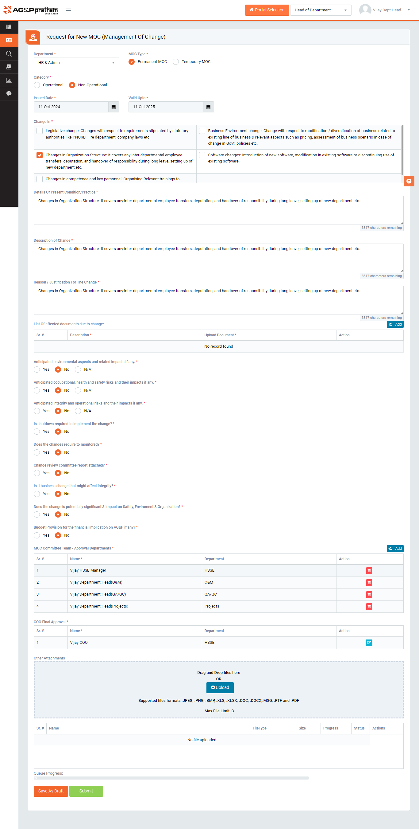 - Request MOC :To request/raise new MOC. Any employee(GA level user) working on the GA, who has access to the system can raise a MOC.