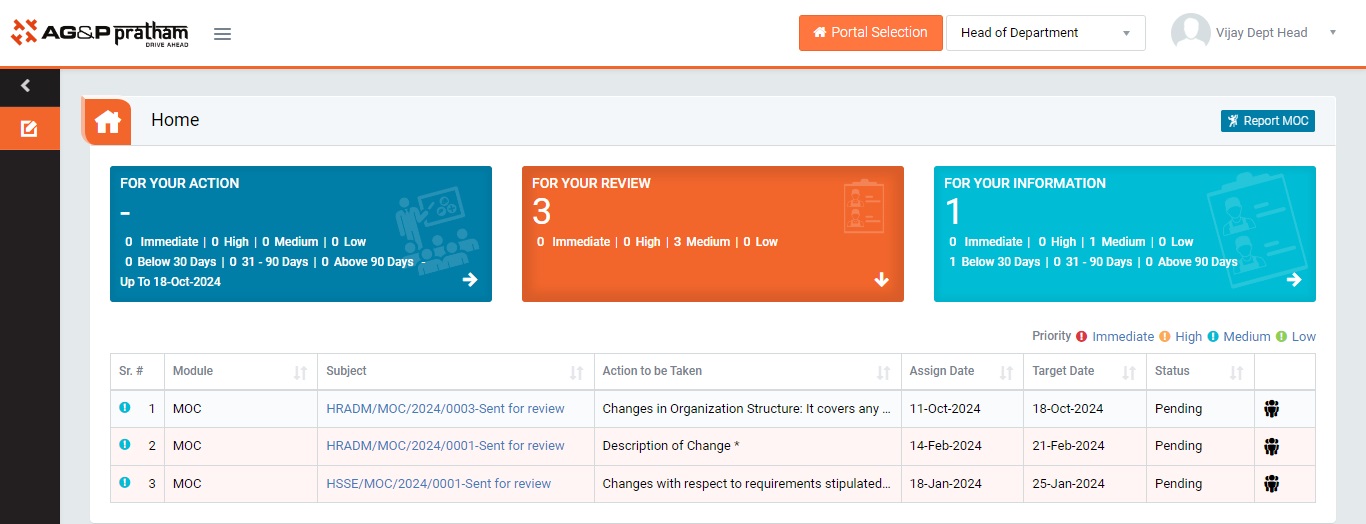 - Login as Reviewer . Navigate to MOC Portal | For Your Review tab. (My_Actionpage)