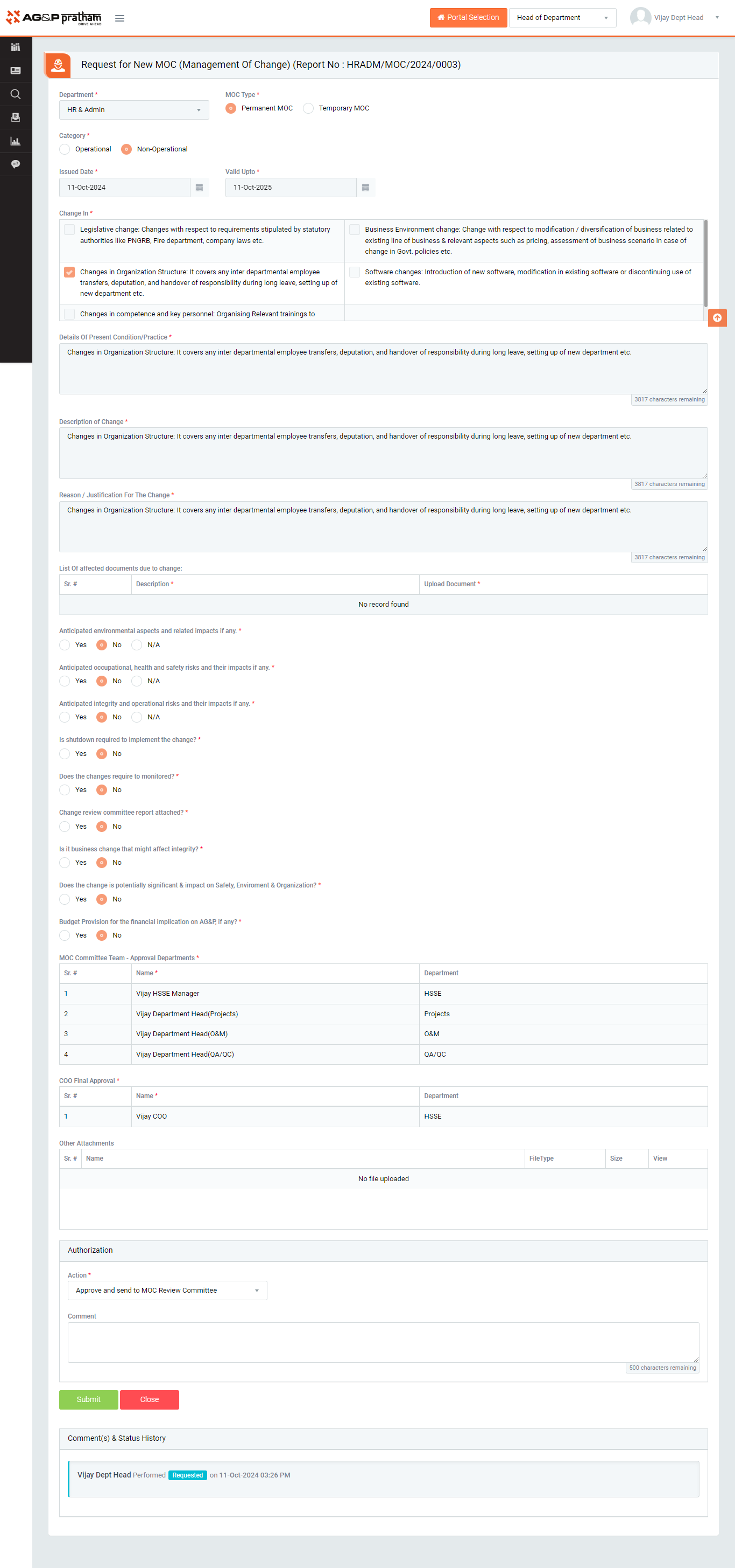 - Next action - GA Head, MOC Coordinator, MOC Review Committee, HO Review Committee, COO etc.