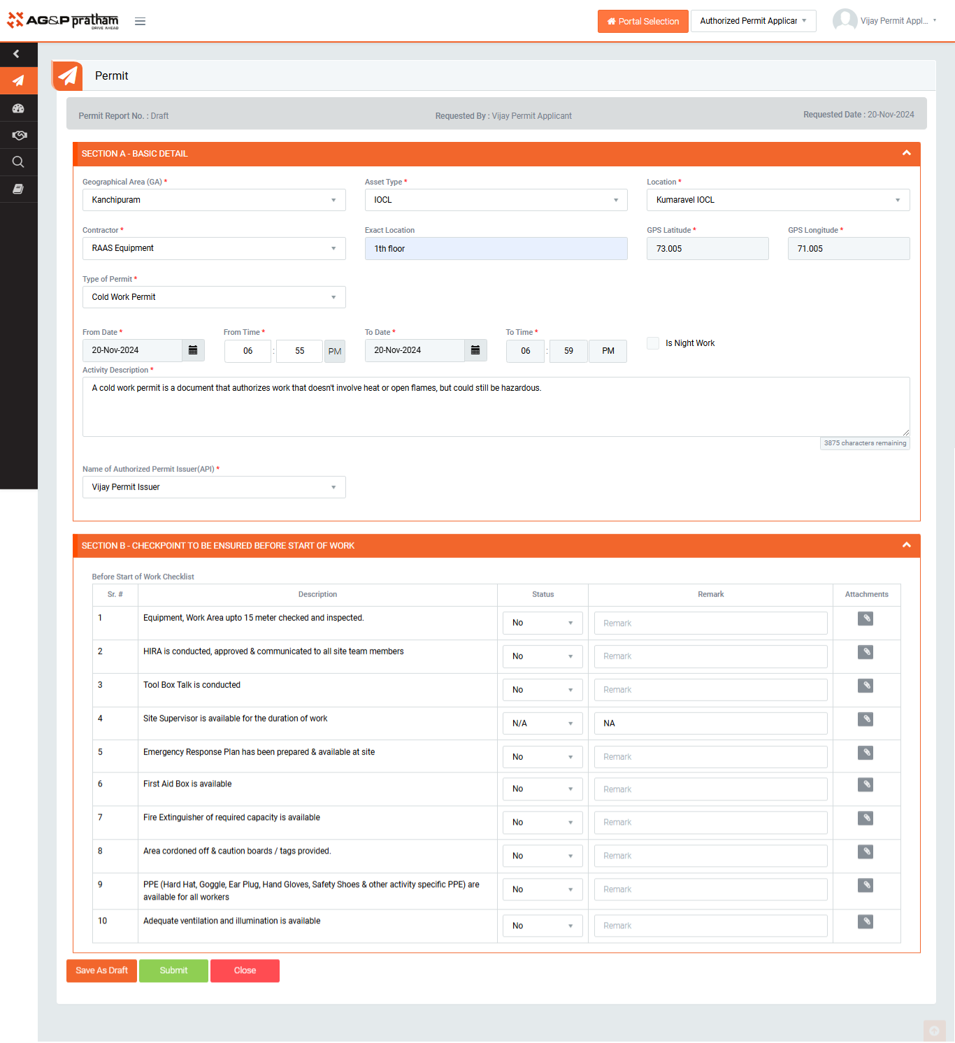 - If Permit Requester user click on ‘Save as Draft’ button then the permit will save in Draft section and only same user can submit the permit