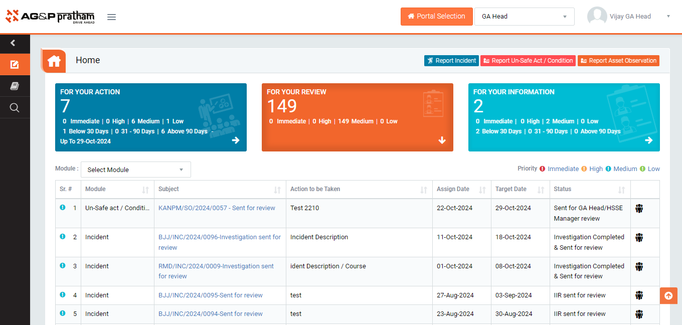 - Login as GA Head / HSSE Manager and navigate to EHS portal and to My Action screen | For your review(Image 1)