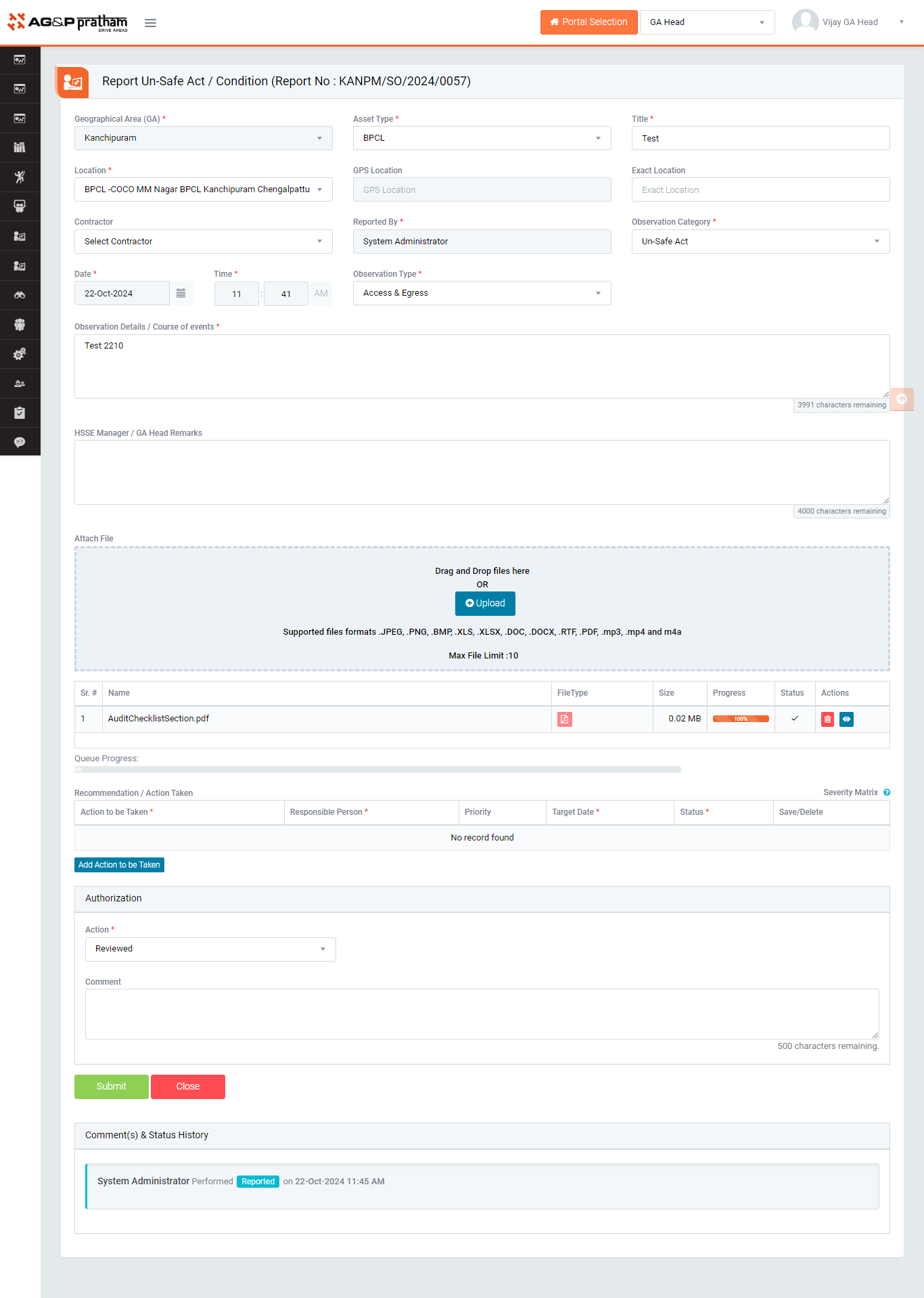 - Reviewed : If observation report is valid then “GA Head / HSSE Manager” shall be able to edit observations details if needed and approve reported observation along with concern person reviews. In this case it’s mandatory to add Action Item.