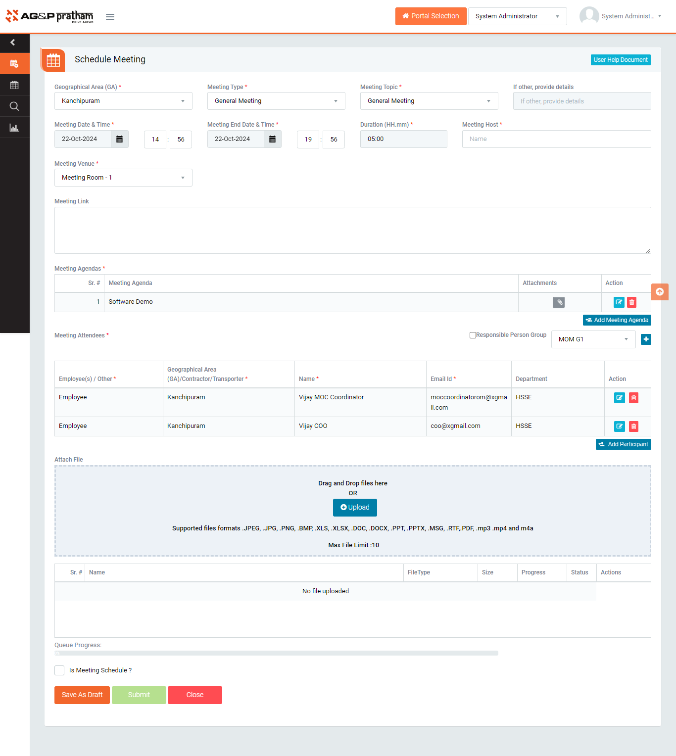 - Click on is schedule meeting and “Submit” button to save the data to conduct meeting at scheduled time.
