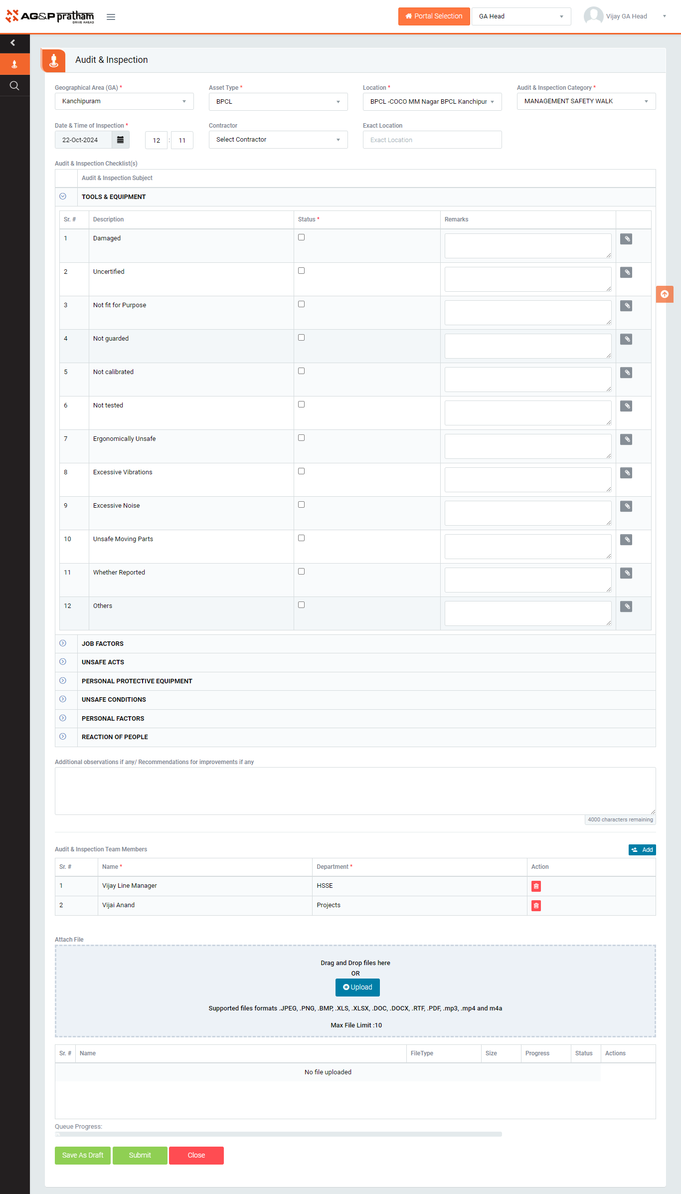 - Select GA, Asset type, location and select audit & inspection category, date of inspection and other details