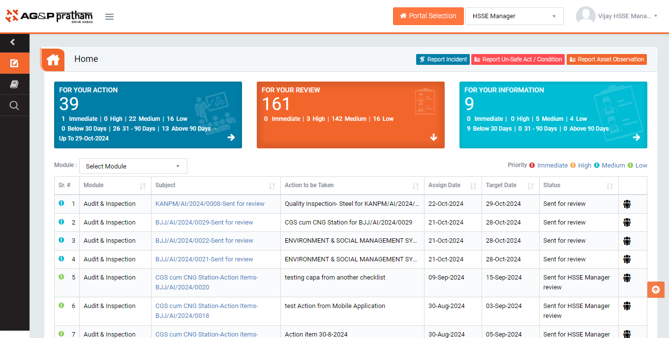 - REVIEW ACTIONS : Display the tasks such as “Incident/Near Miss”, “EHS Observation”, “Audit & Inspection” and “Equipment Inspection” including action items which needs to be reviewed. The tasks will be displayed to reviewer for review where reviewer will take action against it.