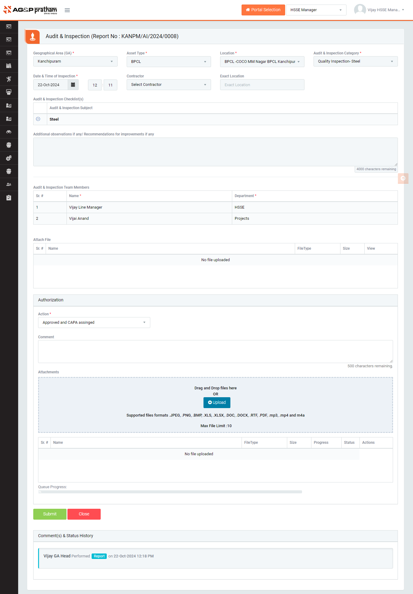 - Approved & CAPA Assigned : If audit report is valid then “HSSE Manager” shall be able to edit audit details if needed and approve reported observation along with concern person reviews. In this case it’s mandatory to add Action Item.